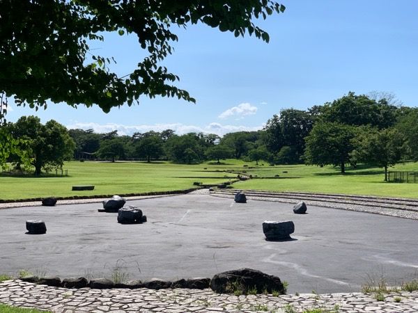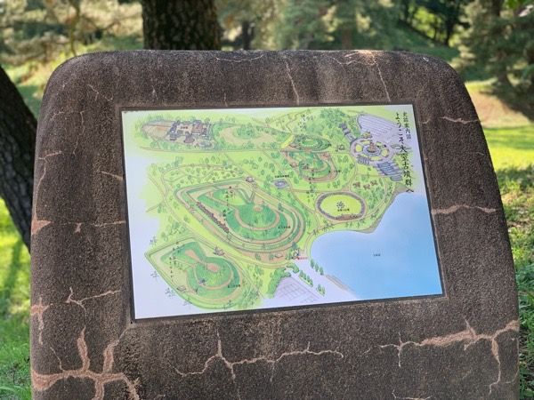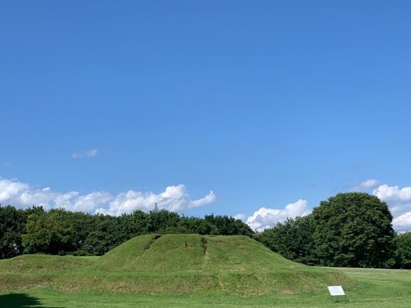 北口駐車場から歩いてほどなく、広々とした原っぱに現れる「M-1号墳」。 「帆立貝式古墳」という形状だそうです。