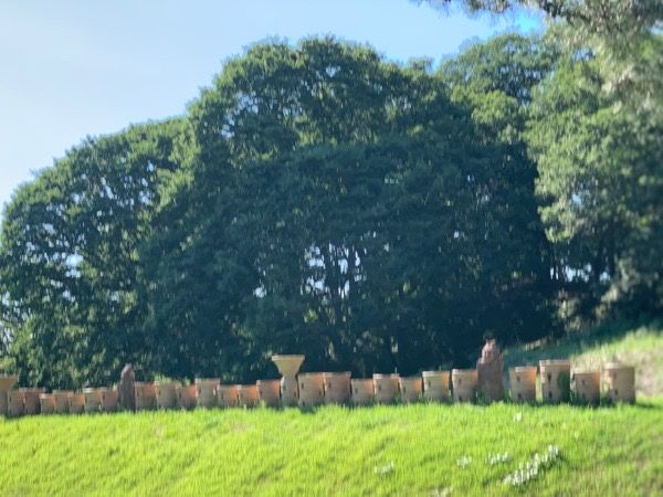 こちらは、「中二子古墳」。大室古墳群の中で最も大きい古墳です。 堤の上に、埴輪が密接して並べられた様子が復元されています。 この古墳ではまだ石室が発見されていないため、墳丘に立ち入らずに外側から見学するようになっています。 いつの日か、石室が発見される日がくるかもしれません。