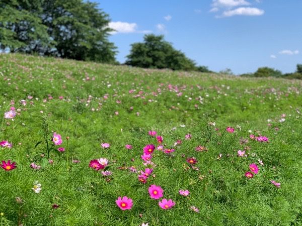 「花の丘」エリアでは、色とりどりのコスモスが咲き乱れていました。 園内では、季節ごとにロウバイや梅、芝桜やポピーなどの花々が楽しめます。 園内のヤドリギの実目当てに、冬には渡り鳥のヒレンジャクという色鮮やかな鳥も来るそうですよ。