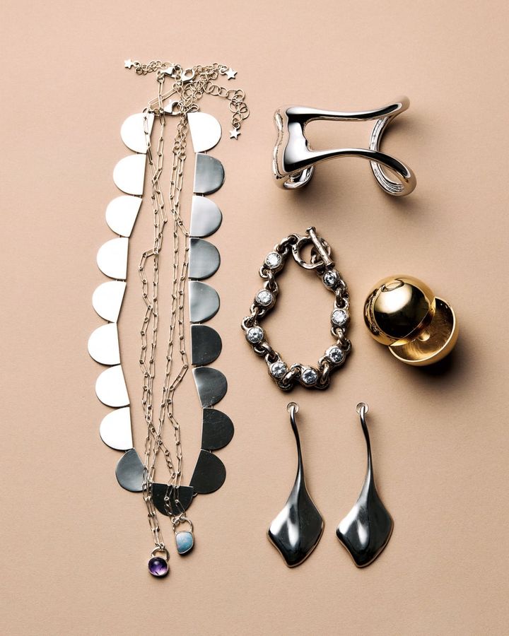 右上から:カーブバングル[合金×ロジウムコーティング]¥20,900(プラス ヴァンドーム)、ピアス[メタル×ゴールドメッキ×サージカルステンレス×チタンポスト]¥28,600 (マユ/マユ ショールーム)、ブレスレット[SV925×CZ]¥163,900(イー・エム/イー・エム アオヤマ)、ピアス[SV925]¥63,800(コールムーン/ショールーム セッション)、アメシストネックレス[SV×アメシスト]¥49,500 、オパールネックレス[SV×オパール]¥57,200 、プレートネックレス[SV]¥56,100(3点プティローブノアー)