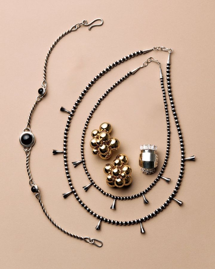 右から:フラワーロングネックレス¥71,500[SV925]、フラワーショートネックレス[SV925]¥43,560(共にエリッカ ニコラス ビゲイ/RHC ロンハーマン)、リング[SV925×CZ]¥63,800(イー・エム/イー・エム アオヤマ)、ピアス[ゴールドプレートレジン×ステンレススチール]¥42,900(ハイク/ボウルズ)、ネックレス[SV925×オニキス]¥110,000(アサミフジカワ/ショールームセッション)
