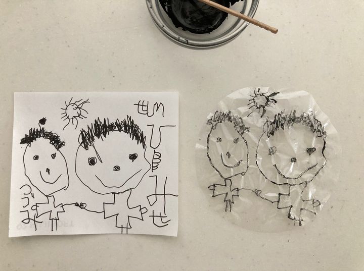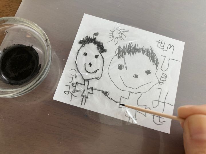 [2]水に溶かした食紅を爪楊枝につけ、イラストを上からなぞって絵を描きます。