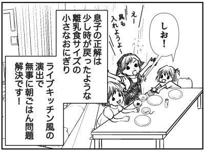 朝ごはんに食べたいものも、食べられる量も、それぞれみんな違います。息子にとっては、離乳食の頃に作っていたような小さなおにぎりが大正解だったのです。それも、作ったものをお皿に乗せておくのではなく、目の前で作るのがいいみたい。