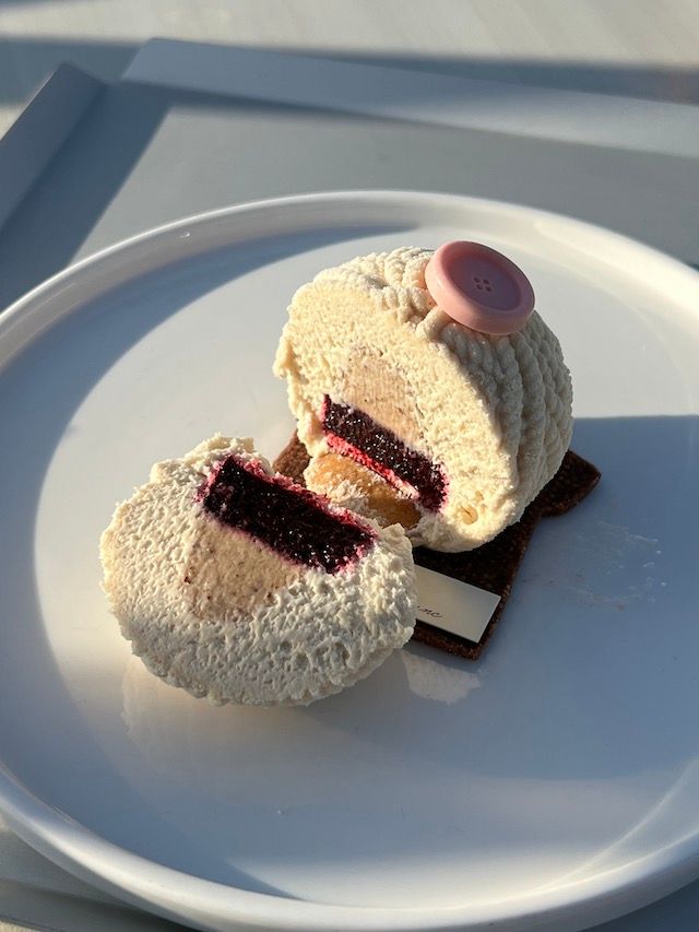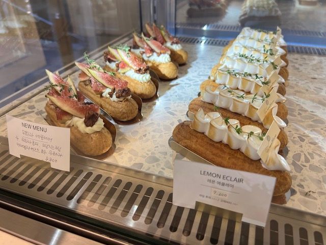 人気なのは毛糸玉のケーキですが、エクレアも人気で、季節によってフルーツが変わっているようです。私が訪れた際は、レモン味と、いちじくのエクレアが提供されており、こちらも美しくておいしいと韓国のローカルには人気。お値段も7200ウォン〜8800ウォン(約820円〜1,000円)でした。(2023年10月当時)