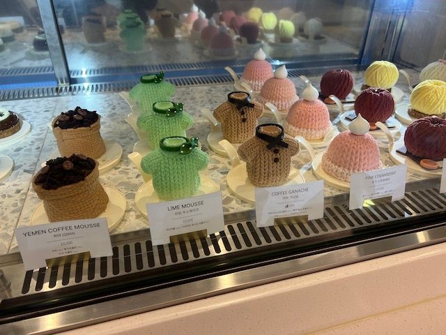 さらに毛糸玉だけでなく、毛糸で編んだニット型のケーキも人気です。帽子の形をしたPINK STRAWBERRY、半袖ニットの形をしたライム味のムース、コーヒーガナッシュがあり、どれにしようか悩んでしまいます。お値段は10,500ウォン(約1,200円)前後でした。(2023年10月当時)