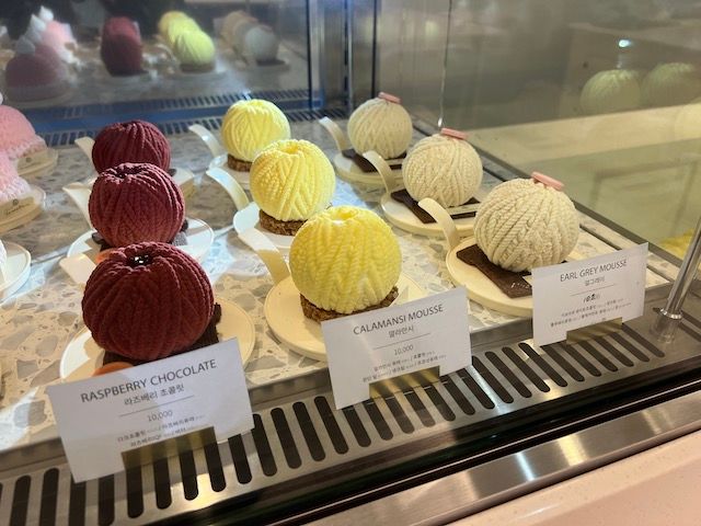 お店に入ると、毛糸で編んだようなケーキがずらり! 本当に毛糸なのではないかと思うほど。毛糸玉になっているケーキがシグニチャーとされており、アールグレイとカラマンシー(酸っぱい柑橘)、ラズベリーチョコレートがありました。訪れた2023年10月当時は、10,200ウォン(約1,100円)前後で提供されており、ケーキにしては少しお高めのお値段ですが、繊細すぎるケーキなので納得です。