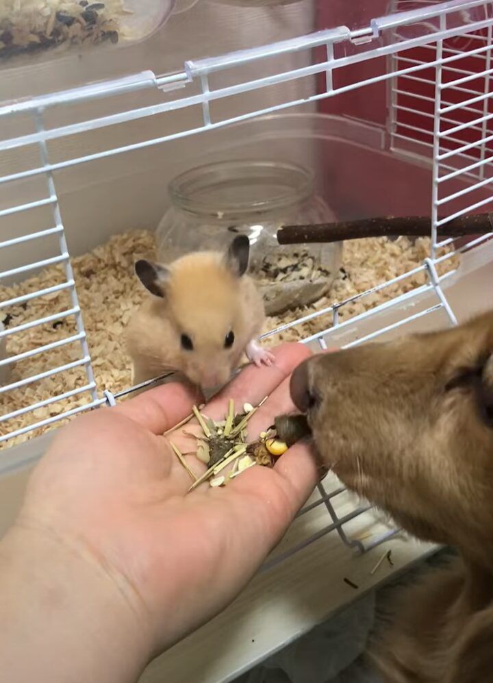 すると、ハムスターも飼い主さんの手からおやつを食べ始めました!