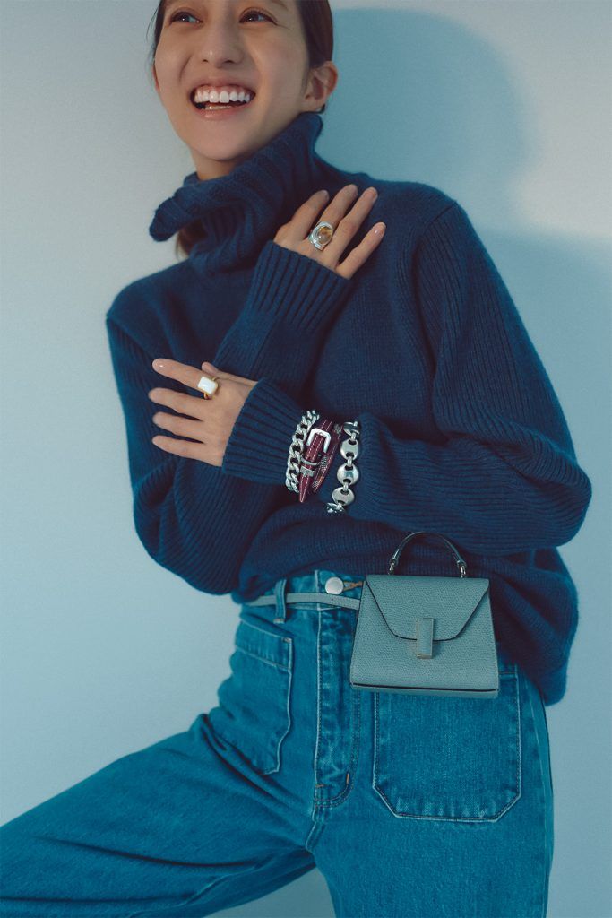 リングやスモールレザーグッズも、手元に負けないものをピックアップ。ブレスレット・手首側から¥26,400(NOJESS)¥64,900(ゴヤール/ゴヤール ジャパン)¥113,300(ソフィーブハイ/エスケーパーズオンライン)リング右手¥73,700(マリハ)左手¥22,000(ラスール/バーニーズ ニューヨーク カスタマーセンター)ニット¥36,300(スローン)パンツ¥15,400(ローラス/JACK of ALL TRADES press room)バッグ¥198,000(ヴァレクストラ/ヴァレクストラ ジャパン)