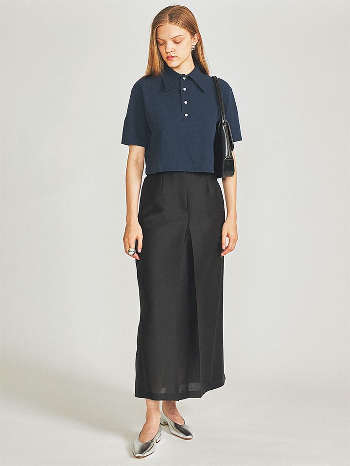 【POINT】端正なネイビーに映える胸元の白ボタンが、上品かつ重く見えない抜け感を演出。肌が見えない程度の短め丈は、細身スカートからワイドパンツまであらゆるボトムともキレイにマッチ。大きなレギュラーカラーには小顔効果も期待できる。