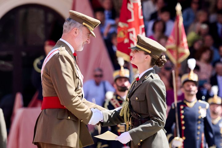 王位継承順位1位のレオノール王女は、現在18歳。将来、女王としてスペイン軍の最高司令官となることに備え、高校を卒業した昨年夏からかつて父も学んだ同校に入学し、軍事訓練を受けていた。防衛大臣マルガリータ・ロブレスやアラゴン州首相ホルヘ・アスコンらも出席した式典では、21発の祝砲と国歌演奏が行われ、凛々しい軍服姿で臨んだ王女は、国王から少将の任命と軍功十字章の白い徽章を授けられた。