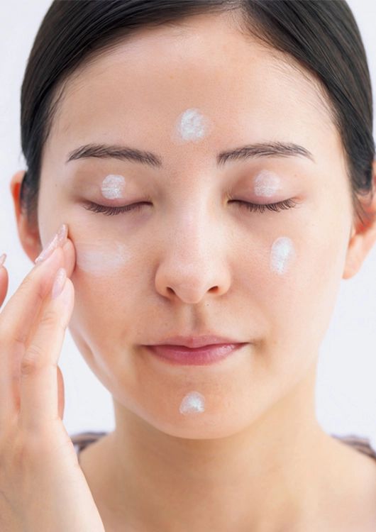 Bを顔全体にのせたら、アゴ下からデコルテまで丁寧になじませます。とにかく平面を意識!