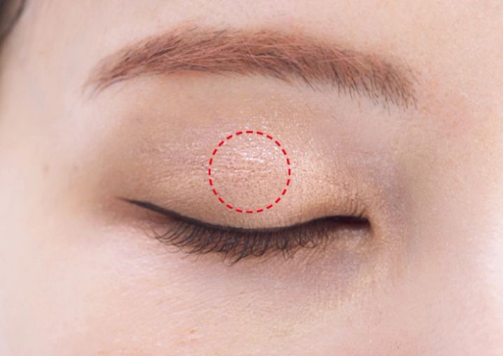 Eの右から2番目を二重幅より気持ち上にぼかします。下まぶたの涙袋にもなじませて目元に明るさを投入。