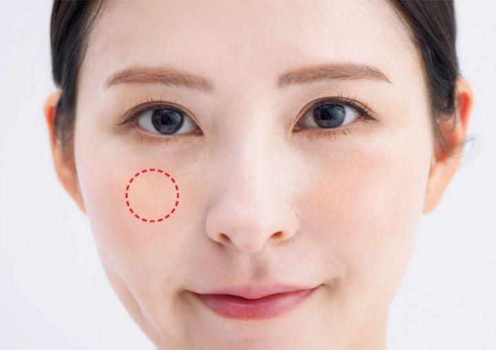 ピーチカラーのクリームチークIを指にとり、目の下に指でポンポンとなじませながら薄く塗り広げます。