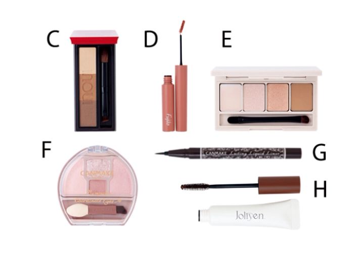 F中央を、まぶた中央に丸く入れる。アイラインGで細く長く、目尻をスッと抜くように引いて。仕上げにHで目元にやわらかさを。
