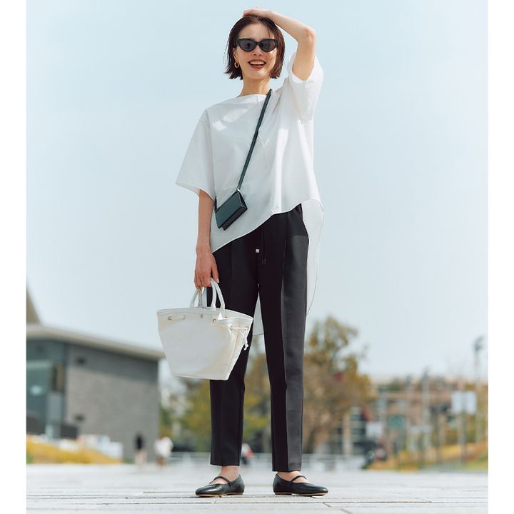 パンツ¥28,600(ロンハーマン)ブラウス¥19,800(ル フィル/LE PHIL NEWoMan新宿店)肩にかけたポシェット¥15,500トートバッグ¥24,900(ともにトゥティエ)シューズ¥40,700(ファビオ ルスコーニ/ファビオ ルスコーニ ルミネ有楽町店)ピアス¥6,000(バナナ・リパブリック)サングラス¥31,900(ブラン/ライト)