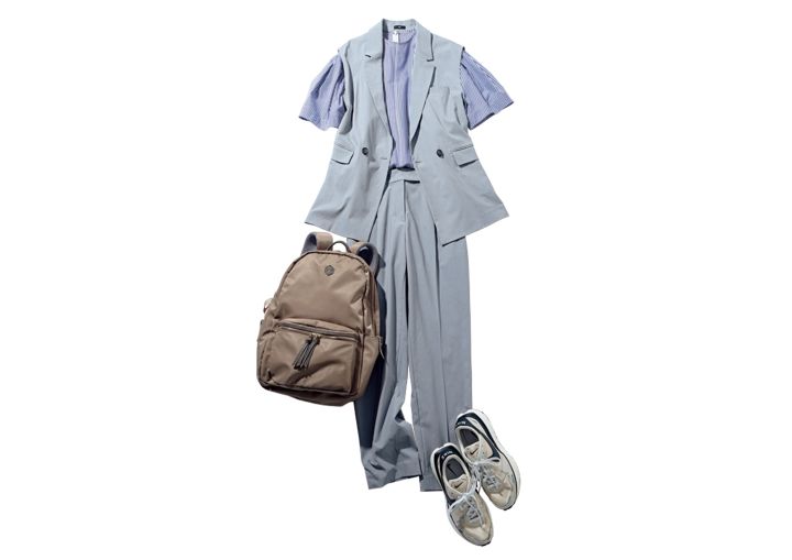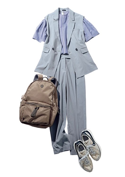 ジレ×パンツSET(ジレ)¥17,000、ジレ×パンツSET(パンツ)¥12,000/ともにPLST ストライプブラウス¥10,450/ミラ オーウェン ルミネ新宿2店 リュックサック¥15,950/ペルケ(アンビリオン) ベージュスニーカー¥13,530/ナイキ スポーツウェア(NIKE)