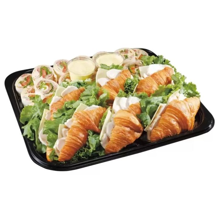 28個のハイローラーと6個のクロワッサンサンドが入ったボリュームのあるプラター。大人数で集まるときにぴったりです。新鮮な具材がたっぷり巻かれたハイローラーは、ベーコンとチーズのまろやかさに野菜のシャキシャキ感がマッチ。クロワッサンサンドは、チキン、レタス、チーズのシンプルな味わいです。