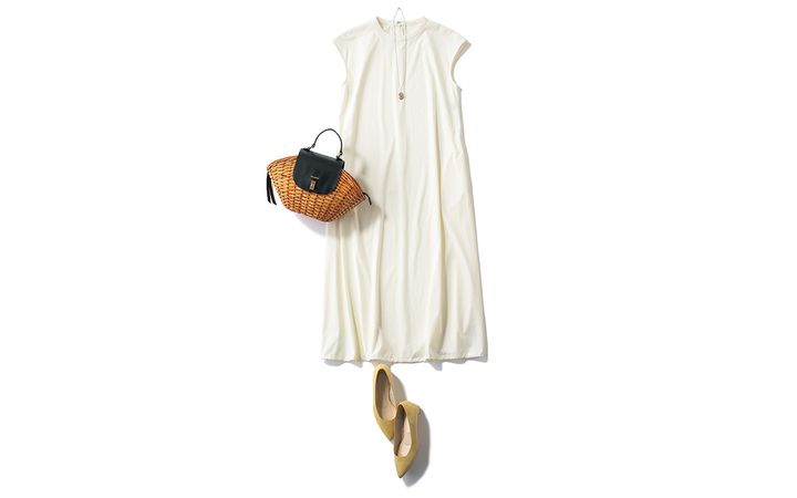 雨の日も飲食のシミにも強気でいられる!裾のドロストを絞るとバルーンシルエットに変形します。ワンピース¥21,890(アンクレイヴ スタンダード/オンワード樫山)