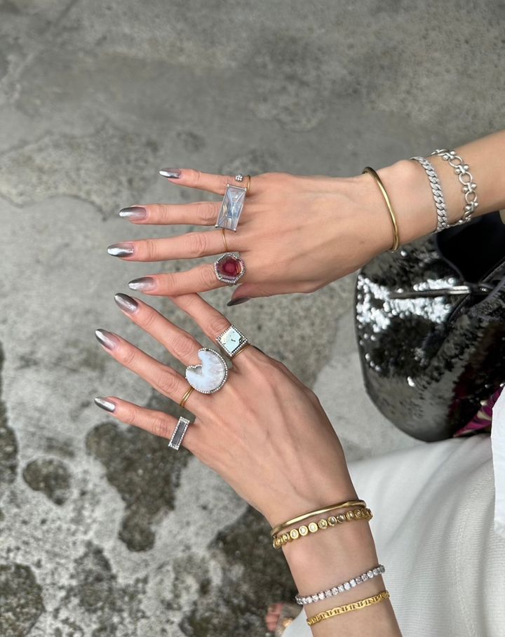 「手元は手首重視でジュエリーをじゃら付けにしています。リングは右手人さし指の色石をワンポイントにしつつ、ドレスに合わせてクリア&ホワイトでクリーンにまとめました」バングル¥275,000、右手ブレスレット¥891,000、左手ブレスレット¥770,000(全てシャランポワ)、右手ブレスレット¥24,200、左手ブレスレット¥44,000、右手人さし指リング¥71,500、右手薬指¥55,000、左手人さし指¥68,200、左手中指¥71,500、左手小指¥59,400(全てアドリン ヒュー)