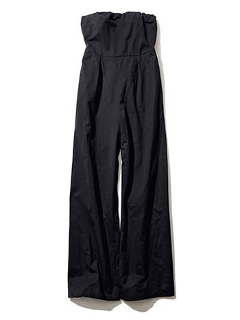 黒ベアトップオールインワン/ロク(ロク 青山) 腰から下のパンツ部分はゆとりがありつつ、ベアトップで上半身をさらにミニマルに。胸下の切り替え部分に配したワンタックが、レッグラインを美しくシャープに表現。