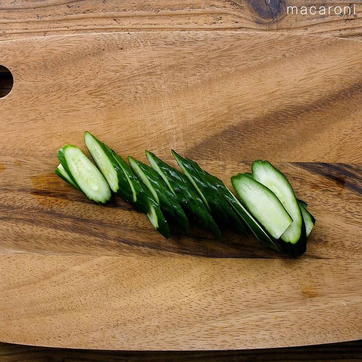 1: きゅうりのヘタを落とし、斜め薄切りにしてから千切りにします。