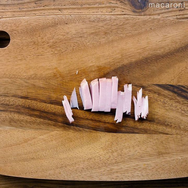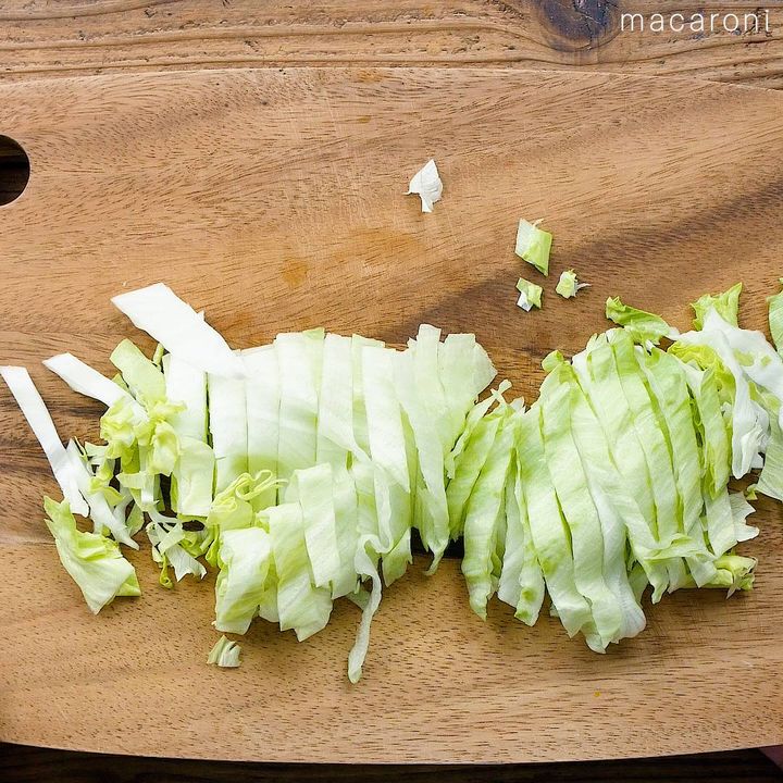 3: ハムときゅうりの幅に合わせて、レタスを千切りにします。