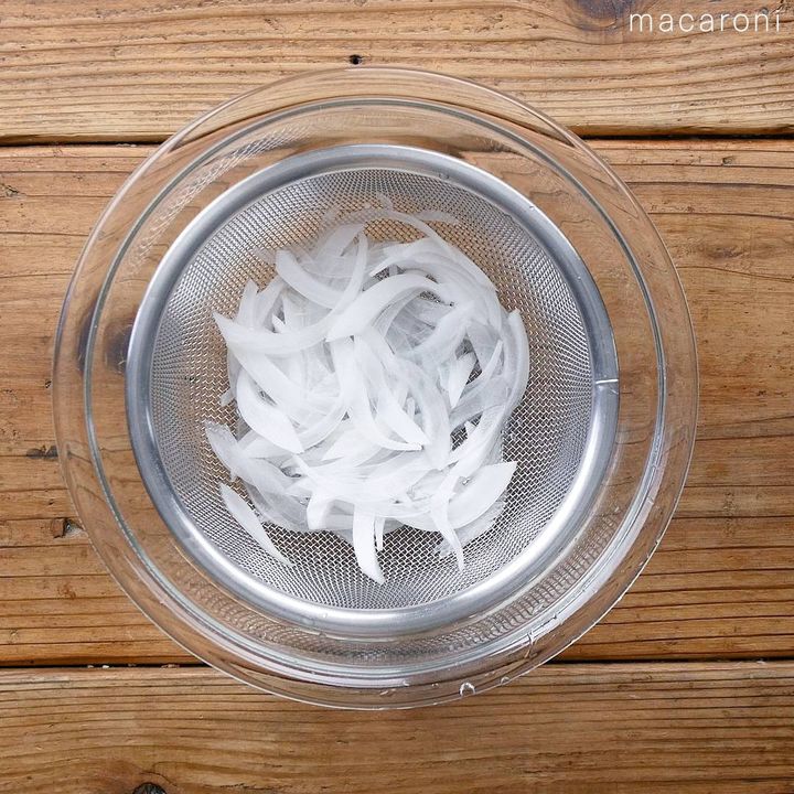 2: 玉ねぎはスライスして10分ほど水にさらし、キッチンペーパーでしっかりと水気を切ります。