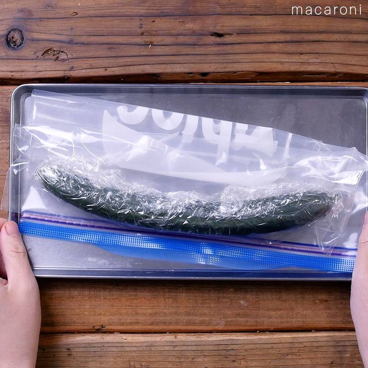1: きゅうりはラップで包み、ジッパー付き保存袋に入れて冷凍します。