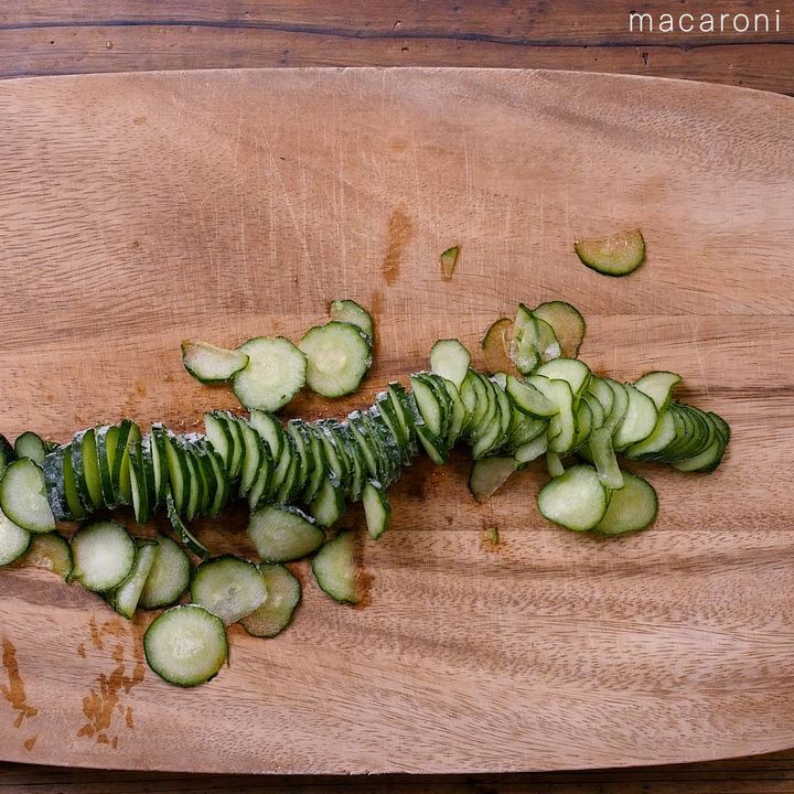 2: 凍ったきゅうりを3分ほどおき、包丁で薄切りにします。