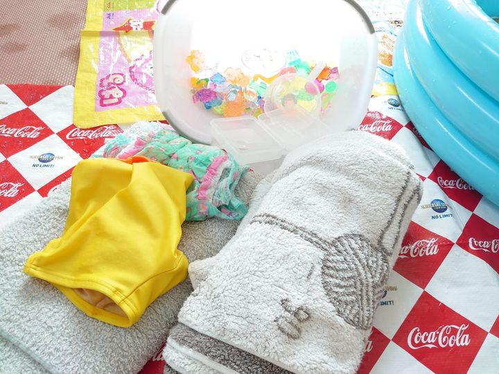 バスタオル2枚。レジャーシート上にとびちった水をふく用と、子どもの体をふく用です。水拭き用はかなりびしょびしょになったので、多めに用意しても良し。