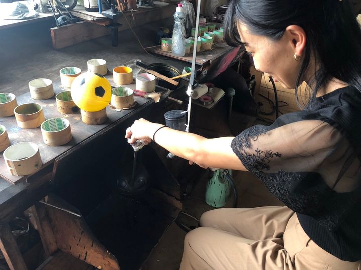 もう片方の金型で蓋をしたら窯入れ工程へと進みます。ここからは職人さんの力が必要ですが、約300度という高温の釜の中でぐるぐると回転させながら、成型し、冷却したら、オリジナルのマイカラーボールが誕生!