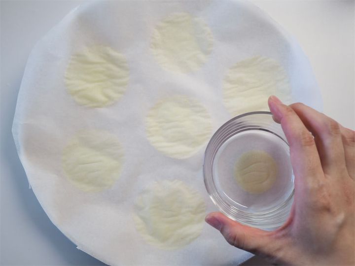6. 5の上にさらにクッキングシートを重ね、平らなコップの底を押し当て生地を薄く伸ばす。