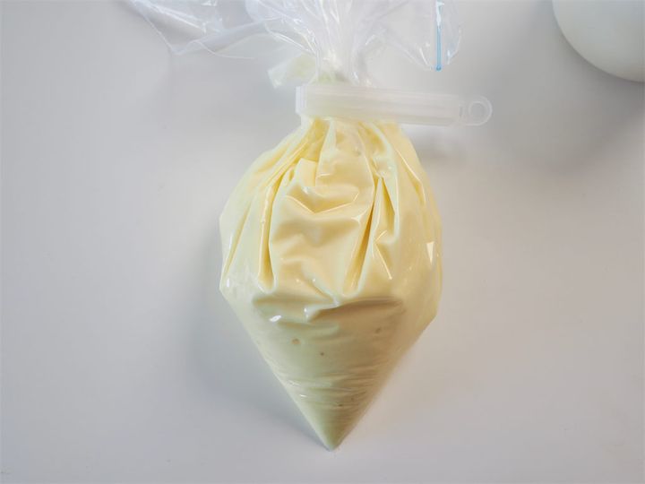 絞り袋は、今回はジッパー付き保存袋を使用。クリップでしっかりとめて、先端を少しだけ切ればOKです。