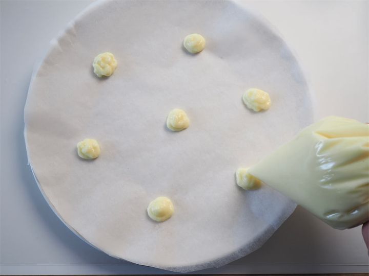 5. 4を絞り袋に入れ、クッキングシートを引いた天板の上に、間隔をあけて絞り出していく。