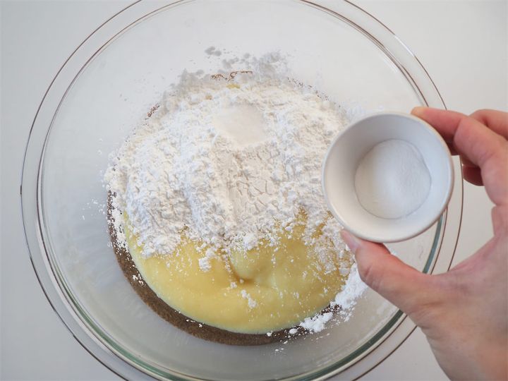 4. 大きめのボウルに3、タピオカでんぷん、ベーキングパウダー、塩を入れ混ぜ合わせる。