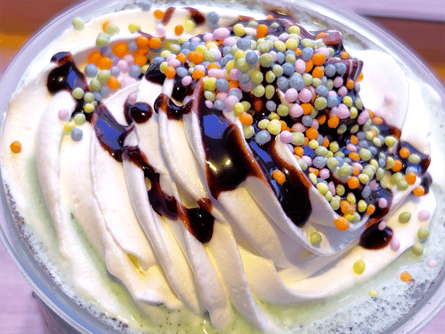 ホイップクリームの上には、カラフルなミント味のキャンディとチョコソースがのっています。この小さなキャンディの、カリカリッとした食感が楽しい! 噛むたびにスーッとするミント感もたまりません。