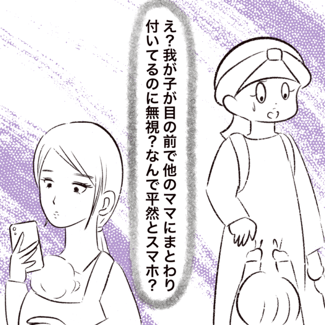 (え?我が子が目の前で他のママにまとわりついてるのに無視?なんで平然とスマホ?)