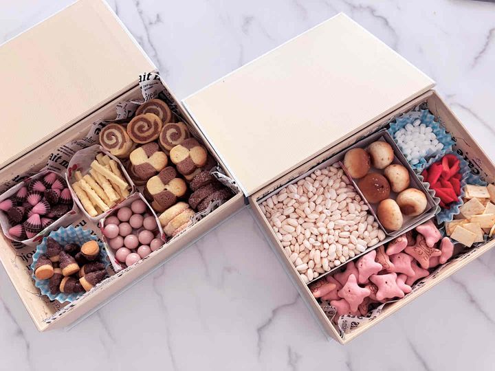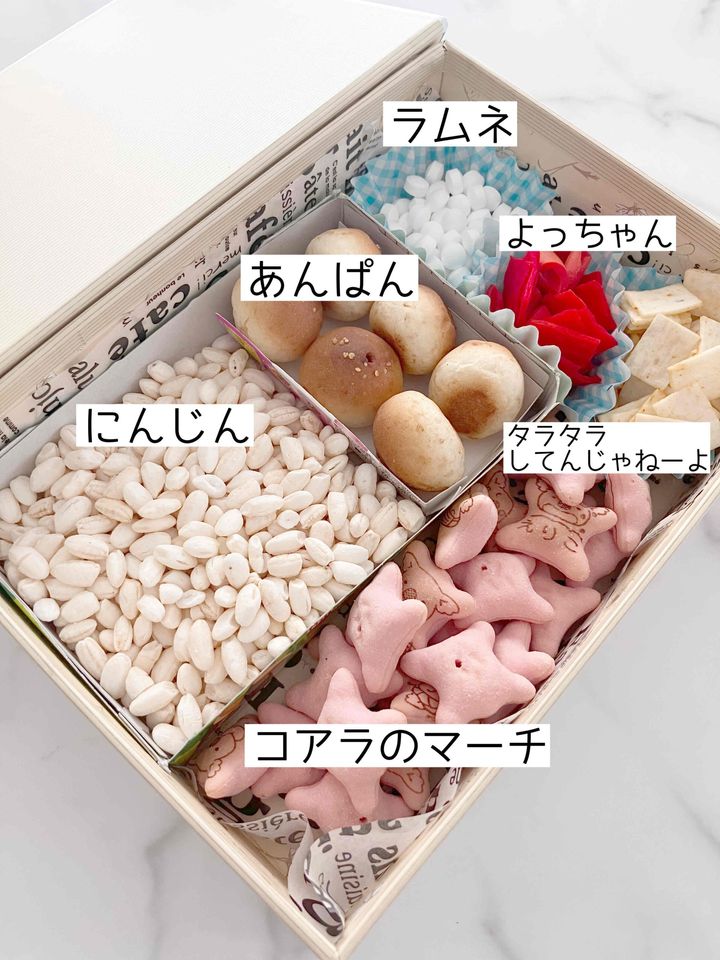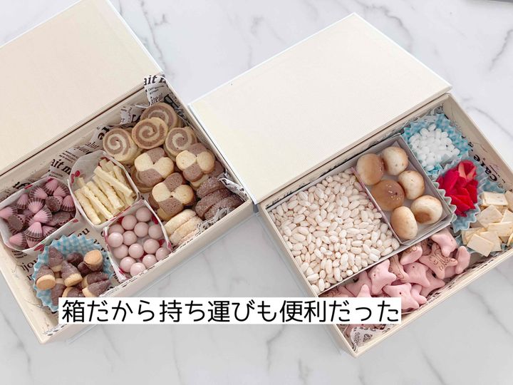 最初はお弁当箱にしようと思ったんだけど、小さすぎるしたくさんの子10人くらいで食べるには食べにくかったので、本型のBOXにしました