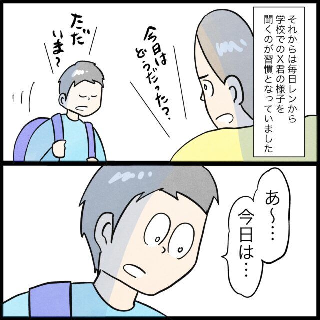 最近元気のないレンくんが気になっていたはんままさんは、ある朝「学校行くの怖い」というレンくんの言葉にとても驚きます。学校で何かあったのか聞いてみると、なんとレンくんはクラスメイトのXくんから毎日暴力を振るわれていたのです。あまりにも衝撃的な内容に驚きとショックを受けたはんままさん・・・どうすれば良いのか悩みます・・・。