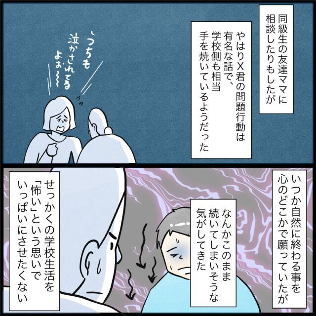 子どもが辛い思いをするのは親もとても辛いですね。あまりにも酷いXくんの暴力・・・先生に報告して改善するといいのですが・・・。