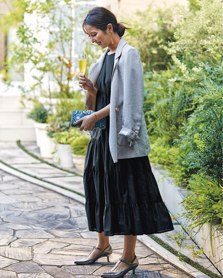 10月22日(土)、ホテル女子会やウェディングなど、大人女子がドレスアップをするなら「ジャケット」で仕上げるのがコツ。フェミニンなティアードワンピースに、洗練された大人なムードが加わります。ゴールドのアクセサリーで、華やかさを散りばめるのを忘れずに。