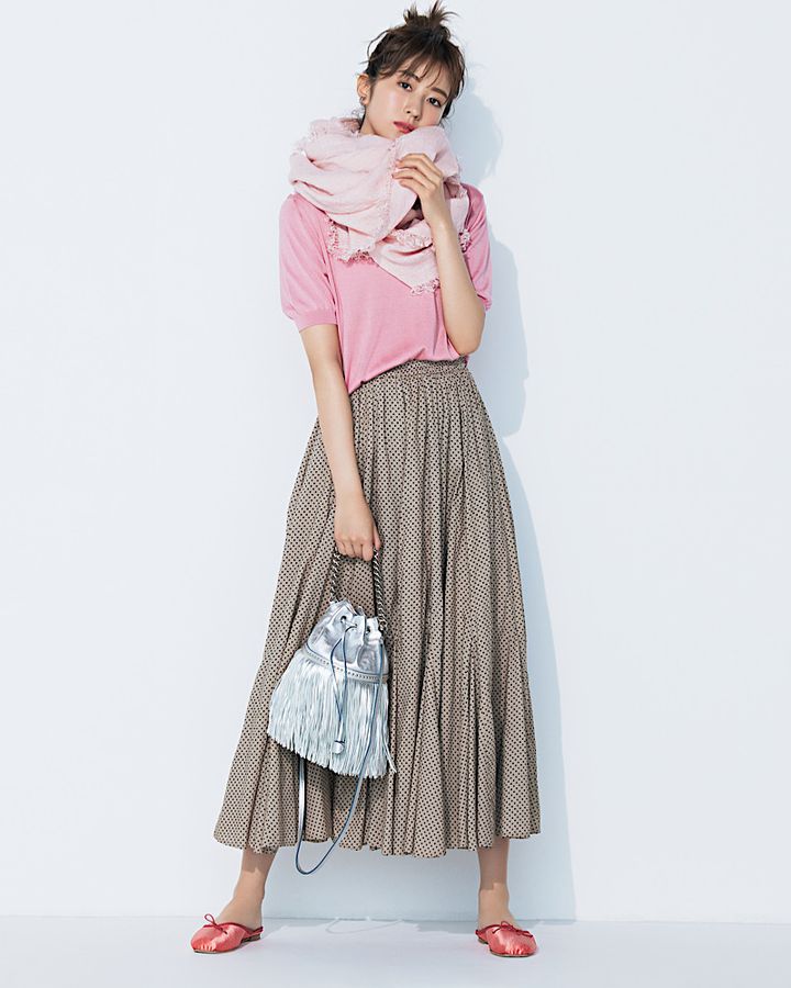 5月30日(日)、コーデがマンネリ化しがちな「ドット柄スカート」は、ベージュ×小さめドットを選べば着こなしが新しく。ピンクのニットやストール、スリッパサンダルでフェミニンにまとめ、シルバーバッグでひとさじのモード感を足す着こなしも今っぽい。