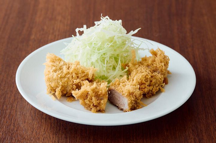 ヒレカツならではの美味しさは、なんといっても豚ヒレ肉のしっとり感です。この肉の質感を生かすためのコツは、厚めに切ること。揚げてから休ませ、余熱でも火を入れると、肉汁を閉じ込めることができます。