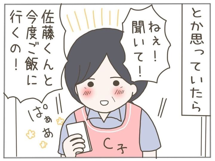 佐藤くん、あっという間に次の「お母さん」に狙いを定めたようです。佐藤くんから食事に誘われたと喜ぶ、独身のC子さん。