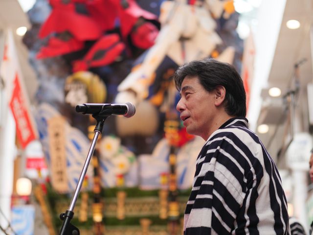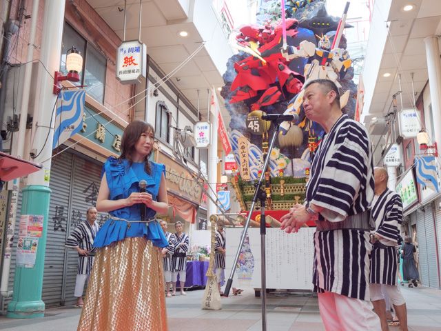 まずは、壇上には、正木研次さん(上川端商店街振興組合理事長)と、長崎正洋さん(八番山笠総務)が登壇されました。 「山笠を通して成長していく子供達と、ガンダムの主人公のアムロが成長していく姿が似ているように感じる。とてもいいコラボができた」とのコメントも。たくさんの方々から拍手が起こります。