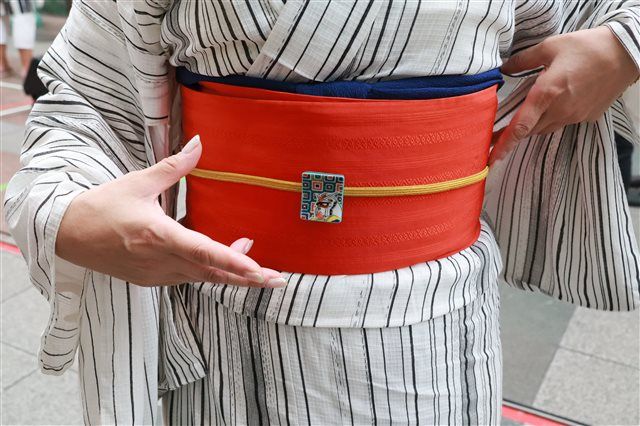 さて。時は飾り山笠公開当日の7/1、朝一番です。私も朝から気合を入れてガンダムカラー「白赤青イエロー」をガッツリと意識した、ガンダムコーデな着物で参上させていただきました。帯留めまでガンダムで手作りしちゃったもんね(笑・どこまでも本気な私)