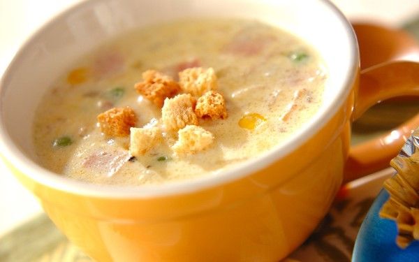 水煮コーン、冷凍グリンピース、ベーコンなどを使う、ほっこり温まる簡単コーンスープです。コーンスープの素と牛乳で簡単においしく仕上がり、料理初心者でも失敗ナシ。グリーンピースとコーンの彩りが鮮やかで、食卓がパッと明るくなる一品です。