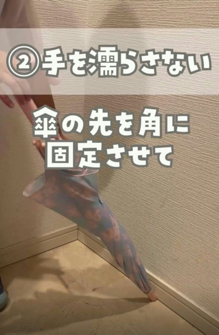 雨でぬれた傘をたたむと、当たり前のように手もぬれてしまいますよね。しかし、この方法を使えば、あまり手をぬらすことなく傘をたたむことができます。まず、傘の先端部分を壁の角に固定させます。画像を参考にしてみてくださいね。