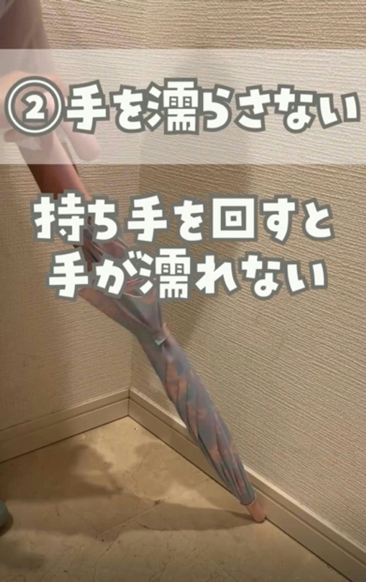 そのままの状態で、傘をまとめるテープを持ちながら、持ち手をまわしていきます。こうすることで、ぬれた傘を触ること無く、傘をたたむことができました。