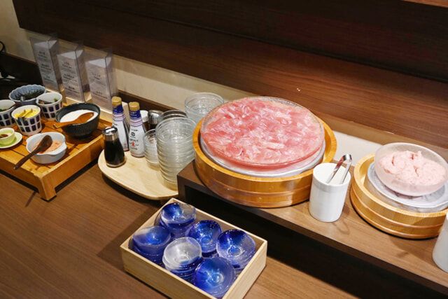 白米のご飯にマグロの赤身とネギトロをトッピング。醤油は東京あきるの市にある近藤醸造の刺身用「五郎兵衛醤油」を用意します。ビジネスホテルの朝食で、豊洲市場直送のマグロをいただけるのは、とっても幸せです。